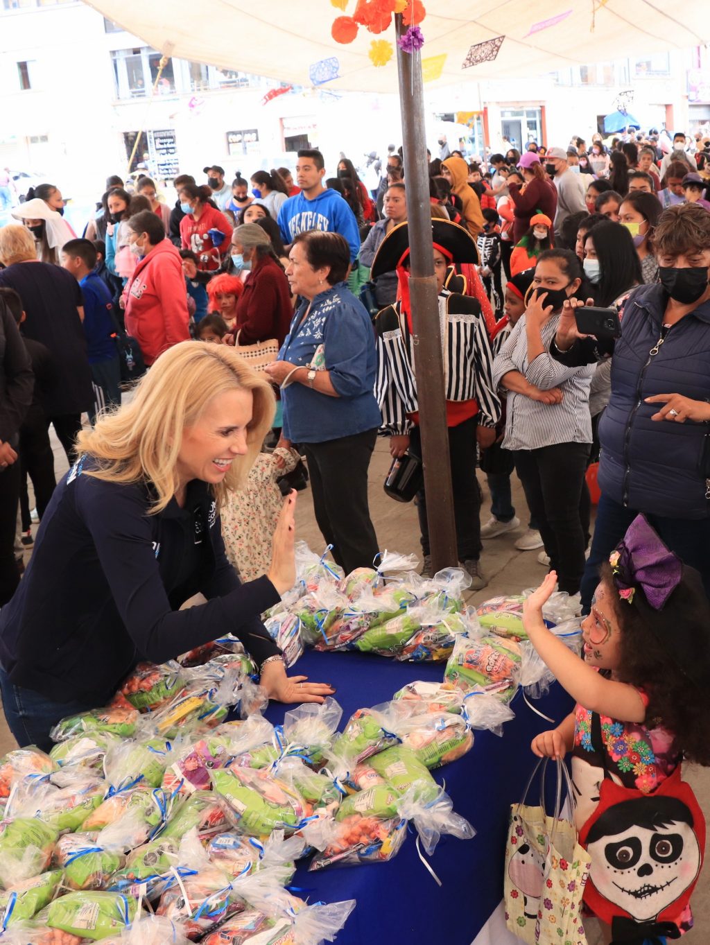 Huixquilucan, Estado de México, noviembre 01, 2022.- En el marco del Día de Muertos, la presidenta municipal, Romina Contreras Carrasco, encabezó la entrega de la tradicional “calaverita” a niños y niñas de la zona tradicional de Huixquilucan, incluyendo a los pequeños que se encuentran en el Albergue Renacer del Complejo Rosa Mística del Sistema Municipal DIF.