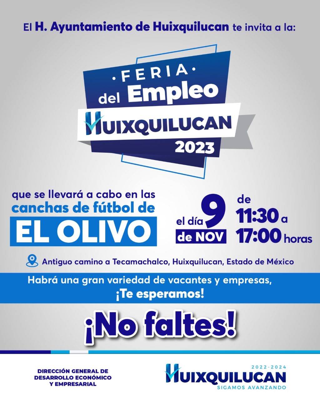 El Gobierno de Huixquilucan hace un llamado a la población interesada en asistir a la segunda “Feria del Empleo Huixquilucan 2023”, para que acuda el 09 de noviembre a las canchas de futbol de “El Olivo”, de las 11:30 a las 17:00 horas.