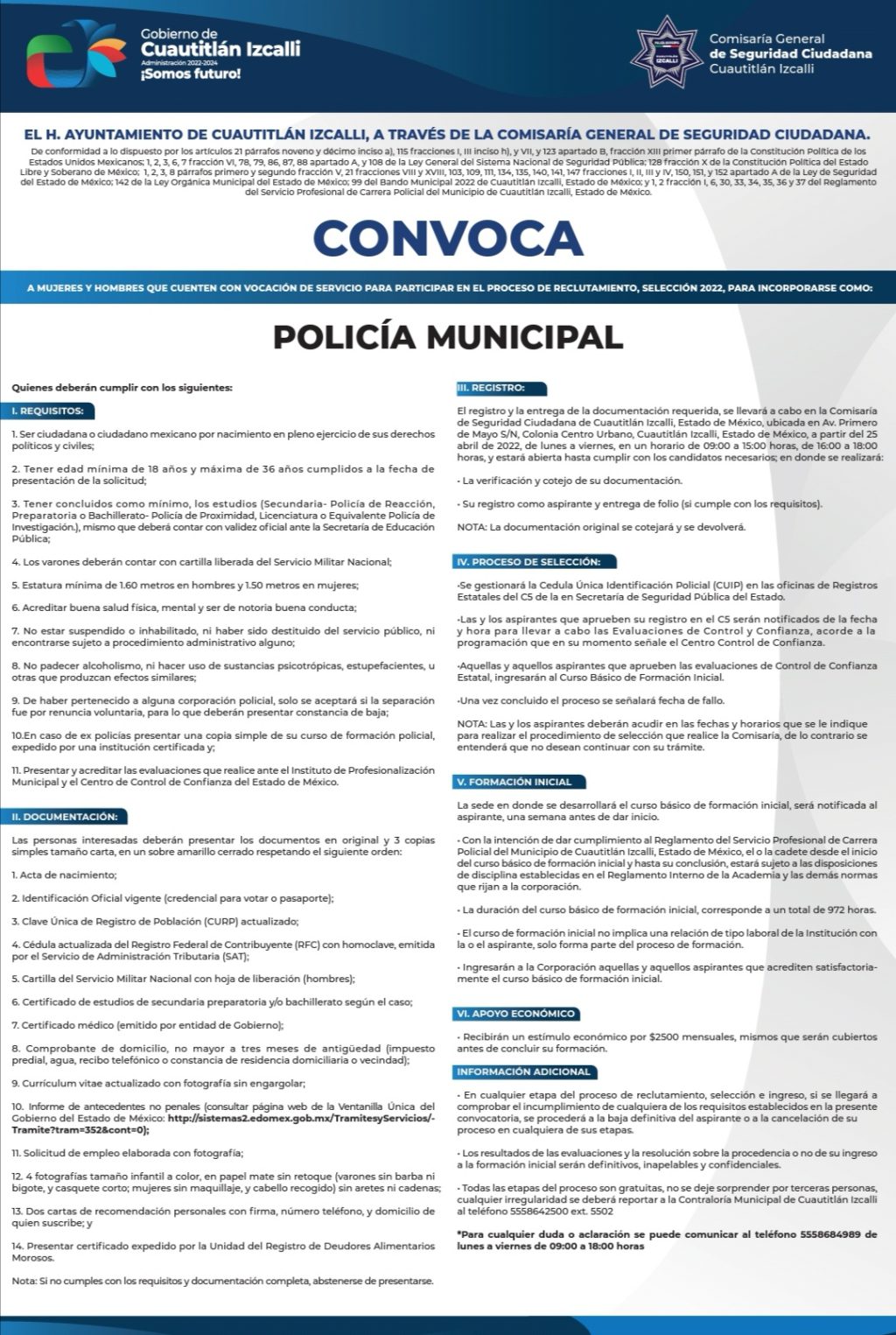 El Gobierno Municipal de Cuautitlán Izcalli, que preside Karla Fiesco García a través de la Comisaría General de Seguridad Pública, convoca a mujeres y hombres que cuenten con vocación de servicio para participar en el proceso de reclutamiento y selección 2022, para incorporarse como: Policía Municipal.
