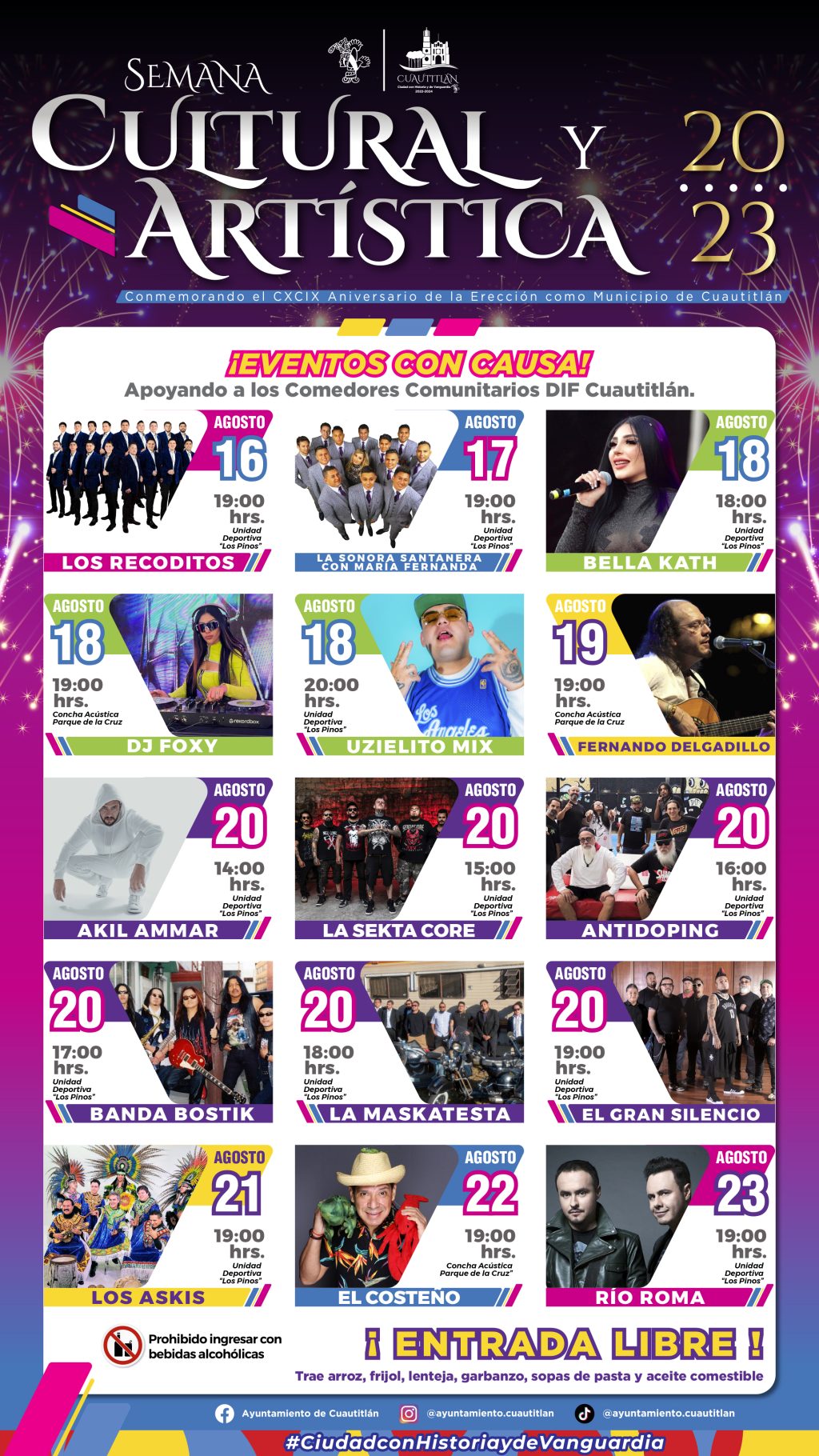 Este miércoles, el presidente del municipio de Cuautitlán Aldo Ledezma Reyna en compañía de su esposa la presidenta del SM DIF Brenda Aguilar Zamora, hablaron acerca de la semana cultural con motivo de la conmemoración del 199 aniversario de la Erección como Municipio de Cuautitlán que dará inicio el día 16 hasta el 23 de agosto del 2023. Recalcaron que el objetivo principal de esta semana cultural es reforzar la identidad del municipio y las tradiciones que tenemos actualmente. Así mismo, comentaron que no solamente es una fecha conmemorativa, sino que también es una oportunidad para exponer las diferentes expresiones del arte de las y los cuautitlenses. En este caso, se presentarán distintos artistas aptos para todas las edades y gustos musicales, ya que el objetivo de la administración es la inclusión social. También, se dio a conocer que la actual administración es pionera en realizar un evento de esta magnitud para celebrar una fecha tan importante como lo es la conmemoración del 199 aniversario de la Erección como Municipio de Cuautitlán durante una semana completa en la segunda semana del mes de agosto. Además, aclaró que el “boleto” de entrada para este evento serán productos pertenecientes a la canasta básica, como lo son: aceite, arroz, frijoles, garbanzo, lenteja, haba, azúcar, avena, harina de trigo, maicena, leche, consomé de pollo, sal, canela o sopa de pasta las cuales serán donadas a los distintos comedores comunitarios del Sistema Municipal DIF disponibles en el municipio ubicados en Rancho San Blas, Galaxia y próximamente la inauguración de un nuevo comedor comunitario en San Blas por parte de la presidenta del Sistema Municipal DIF Brenda Aguilar Zamora. En dichos comedores comunitarios, se utilizarán estos alimentos para servir platos completamente sanos y balanceados a bajo costo para cuidar del bienestar de los cuautitlenses en condición de bajos recursos que acuden a estos lugares, así como el resguardo de algunos víveres en las bodegas de DIF para dar apertura futuros comedores. Igualmente, se reveló a los presentes por medio de banners, los artistas invitados a este evento como: Los Recoditos, La Sonora Santanera de María Fernanda, Bellakath, DJ Foxy, Uzielito Mix, Fernando Delgadillo, Akil Ammar, La Sekta Core, Antidoping, Banda Bostik, La Maskatesta, El Gran Silencio, Los Askis, El Costeño y Río Roma. Dentro de la rueda de prensa, además del presidente y su esposa, los acompañaron algunos de los artistas invitados que fueron: Bellakath, La Sekta Core, DJ Foxy y Antidoping, quienes invitaron a los residentes de Cuautitlán y municipios vecinos a participar en esta semana cultural con su respectiva donación para seguir apoyando a los comedores comunitarios, de igual manera señalaron que ellos también aportaran con alimentos de la canasta básica. También se espera que este año se supere la cantidad de asistentes a comparación del año pasado que fue de 180 mil personas. Aparte de hablar acerca del festival cultural, el presidente Aldo Ledezma comentó que próximamente se realizarán más obras dentro de nuestro municipio para seguir mejorando el entorno de los residentes y dejarlo en las mejores condiciones posibles.